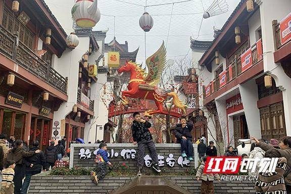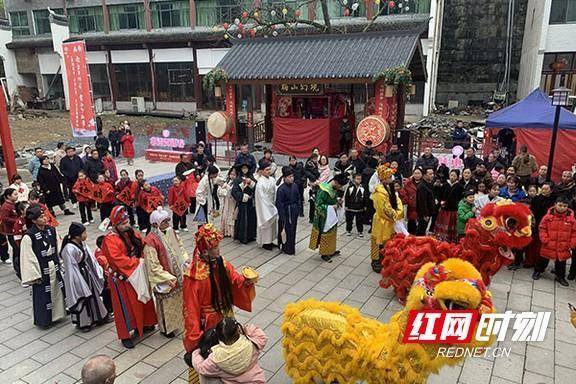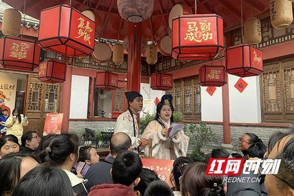 街区醒目装点飞马踏春。“我是特意从益阳驱车过来的,好久没听过这么地道的花鼓戏了,配上这杯芝麻花生茶,小时候过年的感觉一下就回来了!”游客李女士脸上满是笑意,她告诉记者,自己每年都会带家人寻找年味,今年的黄沙坪元宵活动,让她真切感受到了梅山民俗的独特魅力。午后的街区化身沉浸式民俗狂欢场。茶乡百家长龙宴开席迎客,麻辣烫、擂茶、特色小吃一字排开,百人围坐共享团圆滋味,烟火气升腾。梅山非遗食坊前人气火爆,安化发饼、黄精面、柴火香干、苦山村腊肉等非遗美食集中亮相,舌尖上的梅山风味让游客大快朵颐。