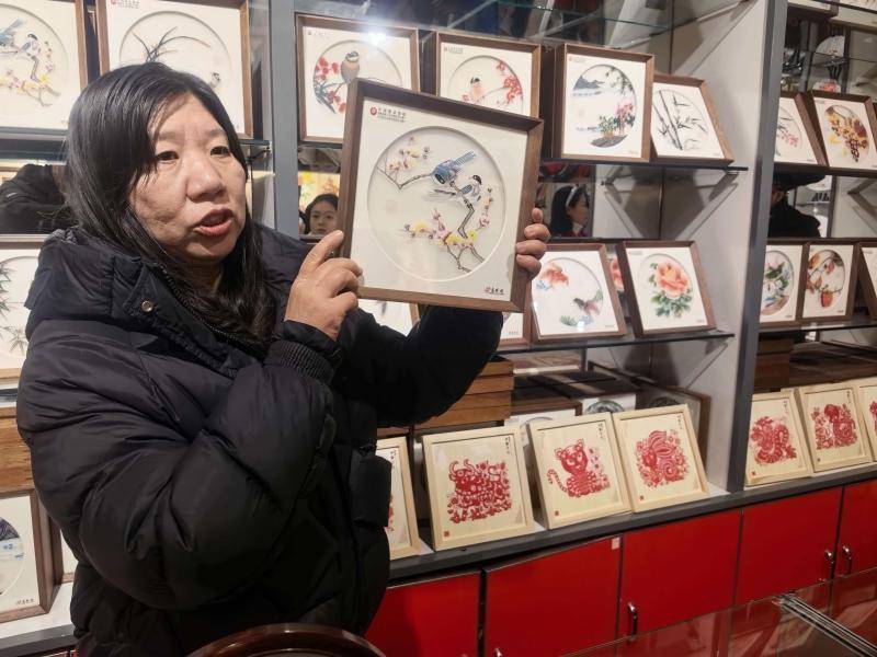 “这里怎么还有照片?”记者走近细看,竟是一幅剪纸作品,不禁惊叹。剪纸侯业务经理张丽萍解释,“照片是通过不同色彩堆叠在一起产生的,每个像素就是一处颜色,这幅作品是一样的道理。”她说,匠人将不同的宣纸按照写实的特点剪裁、上色,形成不同形状、颜色的图层,十几层的宣纸堆叠在一起后,每一层映衬出不一样的元素,从而搭建出光影、颜色、立体结构,才成了一幅以假乱真的剪纸作品。